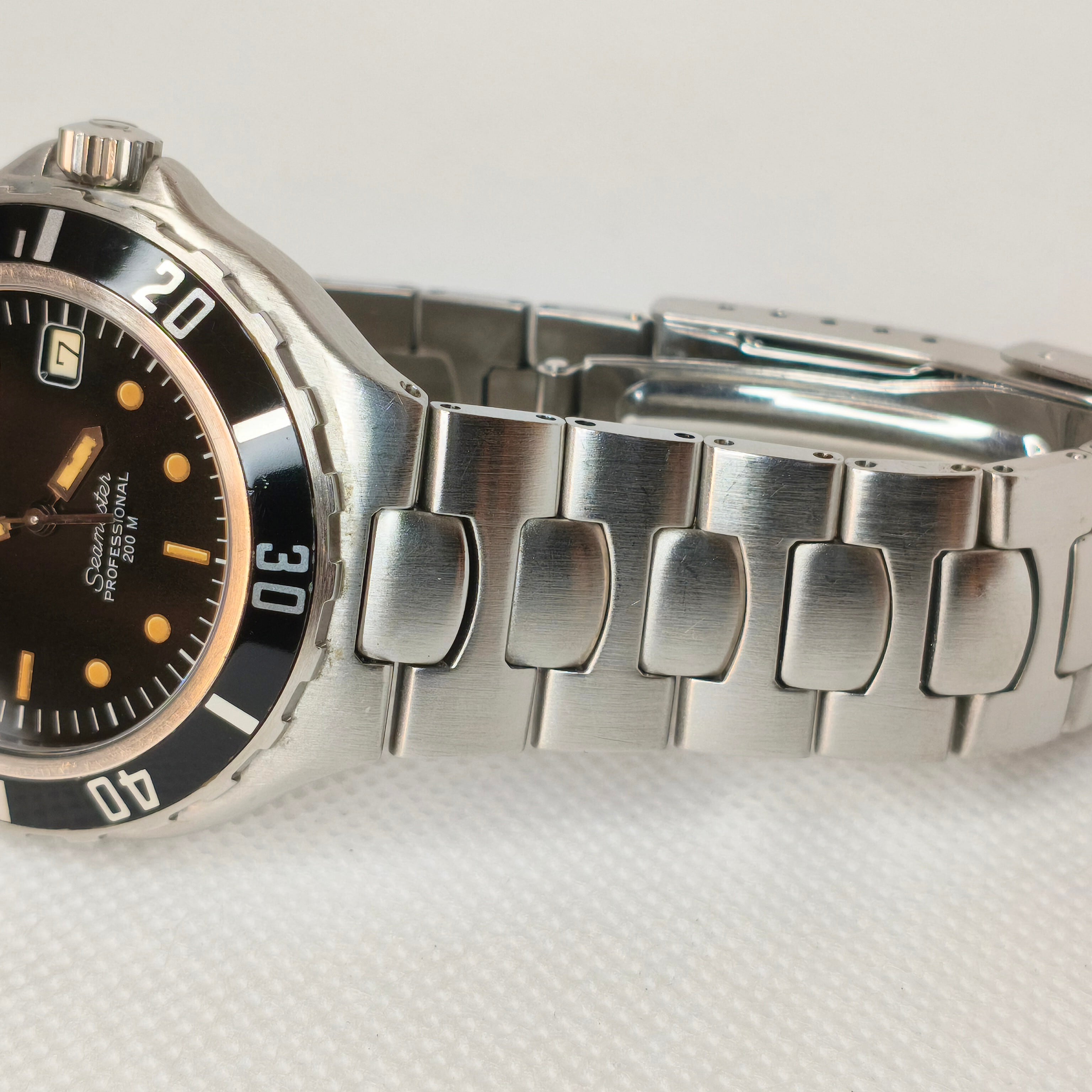 状態面では、ケースの1時・5時・7時方向に打痕、ベゼルやブレスレット全体に経年使用に伴う擦り傷が見られます。しかし、風防(ガラス)や文字盤は非常に綺麗な状態を保っており、視認性は抜群です。針の夜光には経年による劣化が見られますが、現在も暗所での蓄光・視認が可能です。